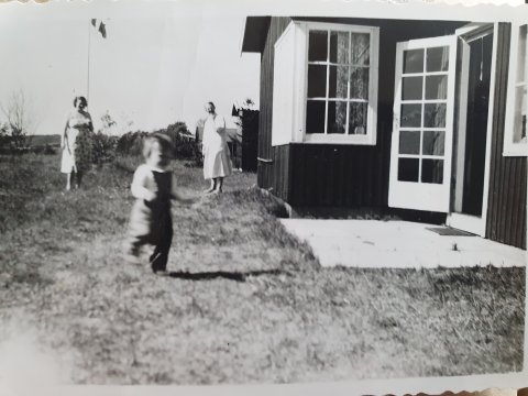 A small cozy cottage was ready to use, spartanly built, but the first house in the area on a largely open field with Mosse on one side and Mossø meadows with small lakes and wetlands on the other—our grandmother here on the new terrace.